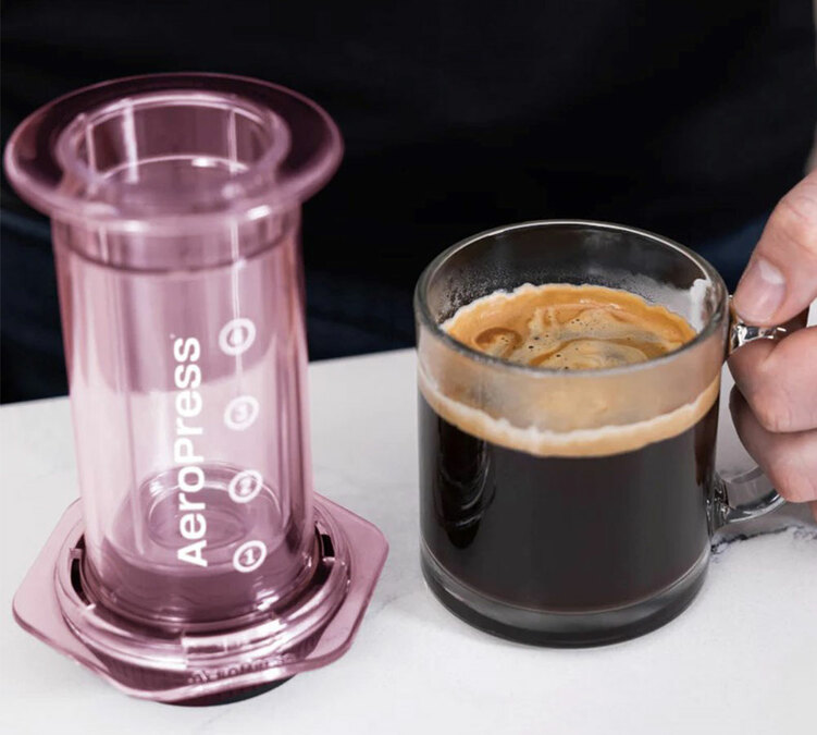 Die AeroPress Clear (Modell in transparentem Pink) hat alle starken Seiten der ursprünglichen AeroPress.