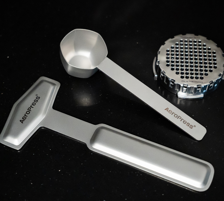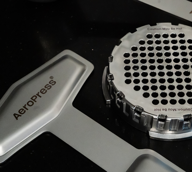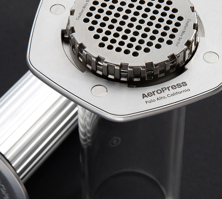 Entdecken Sie die Aeropress Premium Silver aus hochwertigen Materialien: doppelwandiges Borosilikatglas, Edelstahl und eloxiertes Aluminium. Ein echtes Designobjekt, das Ihre Kaffeebar sofort aufwertet und Ihrer Küche einen Hauch von Eleganz verleiht.