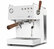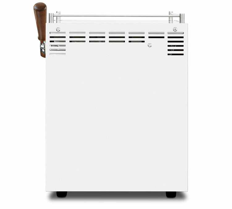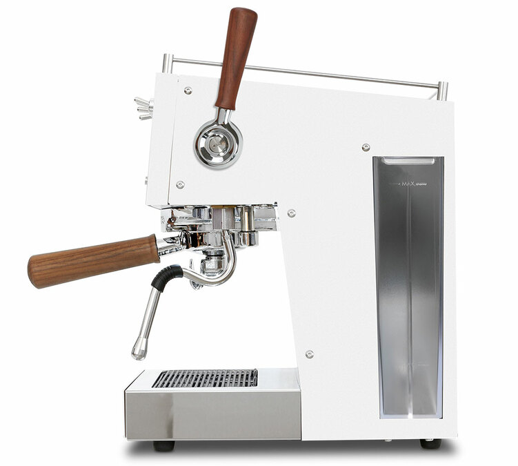 Das Gehäuse ist aus weißem Edelstahl mit Holzoberflächen für den Dampfhebel und den Griff der mitgelieferten Siebträger.