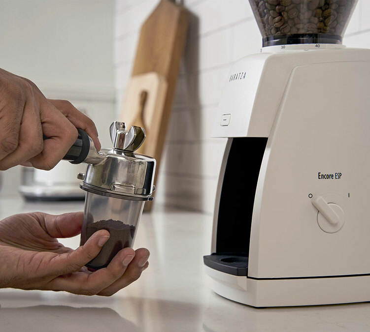 Mit der Baratza Encore ESP können Sie in den mitgelieferten antistatischen Dosierbecher mit 54 mm Durchmesser (und einem 58-mm-Adapter) mahlen, um den gemahlenen Kaffee sauber in den Filterträger Ihrer Siebträgermaschine zu füllen.