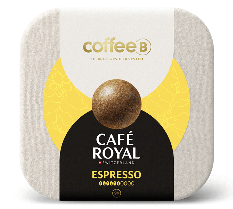 Entdecken Sie das Originalrezept für Espresso im Coffee Ball von Café Royal, dem ausgewogenen Espresso mit sanften Kurkuma-Noten. Der Coffee Ball schützt Ihren Kaffee vor Oxidation, da der Kaffee nach dem Mahlen mit einer Pflanzenfaser umhüllt wird. Der neue Coffee Ball von Café Royal ist vollständig recycelbar und kann auf Ihrem Kompost entsorgt werden.