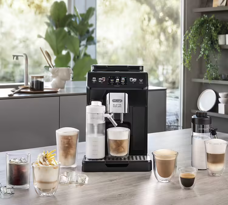 Die DeLonghi Eletta Explore Kaffeemaschine mit integrierter Kaffeemühle hat es sich zur Aufgabe gemacht, Ihnen eine Vielzahl von Geschmäckern und Rezepten näher zu bringen - und Sie werden nicht enttäuscht sein! Stöbern Sie durch 42 Rezepte im Direktzugriff und greifen Sie auf 120 Rezepte in der App zu! Die größte Innovation ist die Karaffe Latte Crema Cool. Diese ermöglicht Ihnen die Zubereitung zahlreicher kalter Milchgetränke.