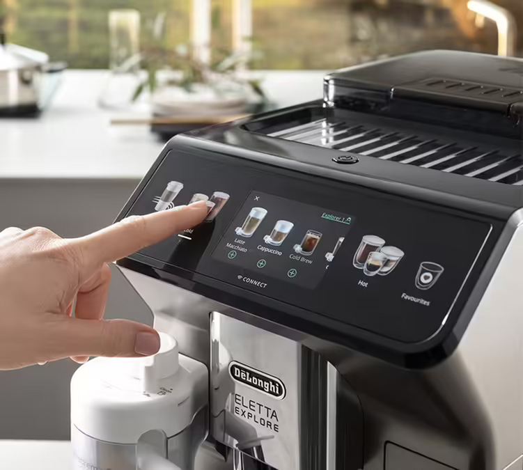 Die DeLonghi Eletta Explore Kaffeemaschine mit integrierter Kaffeemühle hat es sich zur Aufgabe gemacht, Ihnen eine Vielzahl von Geschmäckern und Rezepten näher zu bringen - und Sie werden nicht enttäuscht sein! Stöbern Sie durch 42 Rezepte im Direktzugriff und greifen Sie auf 120 Rezepte in der App zu! Die größte Innovation ist die Karaffe Latte Crema Cool. Diese ermöglicht Ihnen die Zubereitung zahlreicher kalter Milchgetränke.