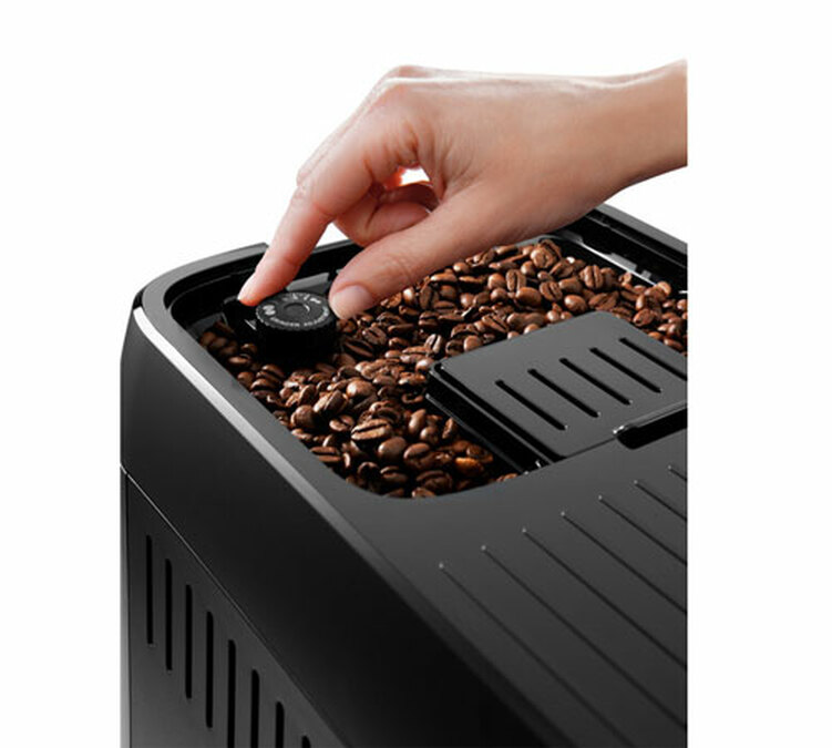 Der Kaffeevollautomat bleibt praktisch mit einem Wasserbehälter, der an der Vorderseite der Maschine zugänglich ist, einem Behâlter für gemahlenen Kaffee, um entkoffeinierten Kaffee zu genießen, und einer höhenverstellbaren Düse von 86 bis 140 mm.