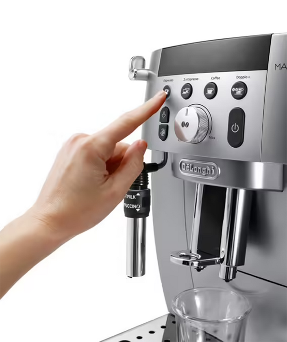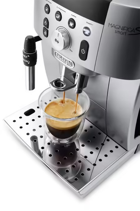 Dieser Kaffeevollautomat Magnifica Smart bietet 3 Getränke mit direktem Zugriff sowie doppelten Espresso. Hier finden Sie den traditionellen Espresso, Coffee (einen langen Kaffee ohne Vorbrühen) und Doppio + (intensiven doppelten Espresso und spezielles Vorbrühen). Diese Maschine ist daher perfekt, wenn Sie kurze und intensive Getränke bevorzugen. Eine Klappe für gemahlenen Kaffee ist ebenfalls erhältlich, um vorgemahlenen Kaffee zu verwenden (z. B. für entkoffeinierten Kaffee).