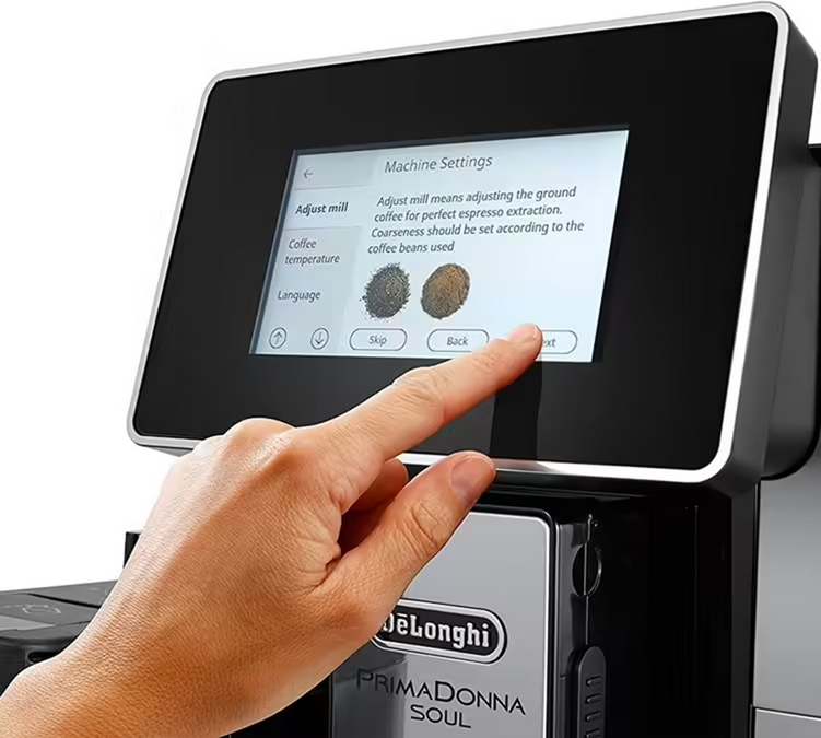 Dieser DeLonghi Vollautomat ist mit einem großen 4,3" TFT-Farb-Touchscreen ausgestattet. Damit ist es ganz einfach, Ihren Kaffeevollautomaten zu bedienen. Sie können direkt auf alle Rezepte zugreifen, indem Sie sie auf der Startseite des Bildschirms durchblättern. Darüber hinaus können Sie jedes der Rezepte im direkten Zugriff auch individuell anpassen.
