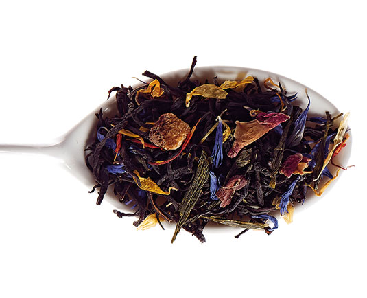 Zutaten: Schwarzer Tee, grüner Tee, Aromen, Orangenschalen, Rosenblüten, Kornblumenblüten, Ringelblumenblüten.