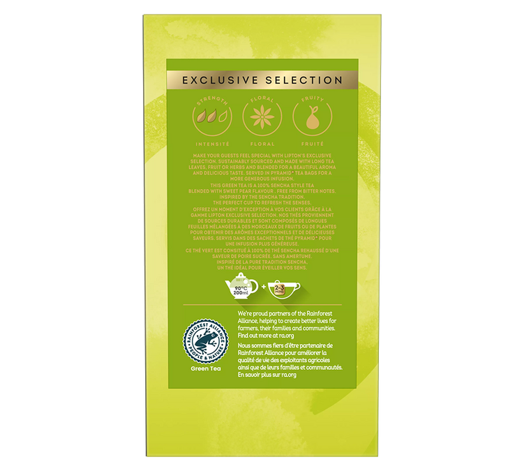 Der Sencha-Grüntee von Lipton gehört zum Sortiment Exclusive Selection der Marke. Es handelt sich um einen Grüntee aus Japan von ausgezeichneter Qualität mit Noten von Birne und Rose, der in einer Spenderpackung mit 25 einzeln verpackten Teebeuteln erhältlich ist. Der perfekte Tee, um ihn Ihren Gästen nach dem Essen oder in einer kleinen Auszeit zu servieren.