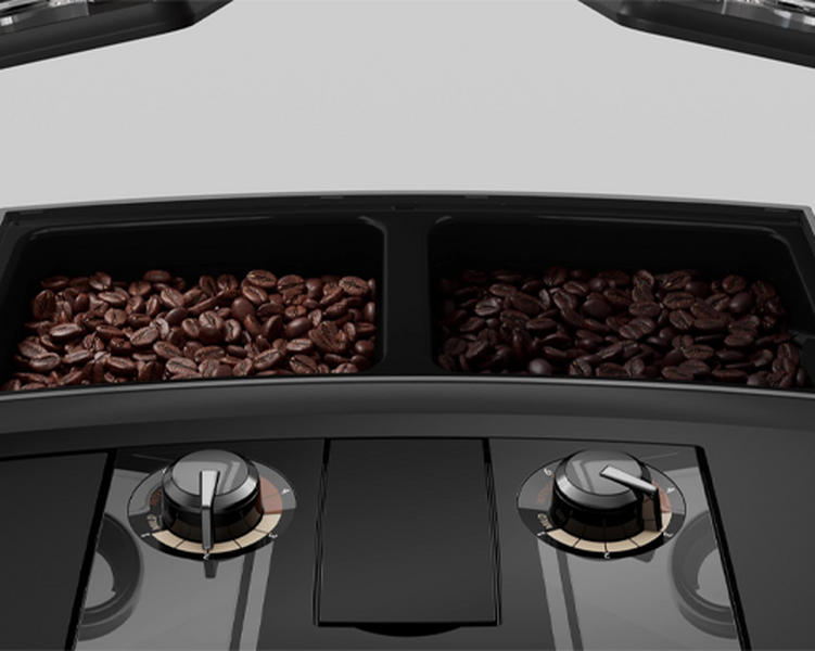 Der doppelte Bohnenbehälter ermöglicht die Aufbewahrung von zwei verschiedenen Bohnen, z. B. einer dunklen Röstung und einer entkoffeinierten Sorte, und sorgt dafür, dass sie vor Feuchtigkeit geschützt bleiben und nur auf Ihren Wunsch hin gemischt werden. Die Aufbewahrung wird durch hermetische Deckel auf den Behältern erleichtert, und es besteht die Möglichkeit, schnell von einer Sorte zur anderen zu wechseln, ohne dass die Aromen verloren gehen.