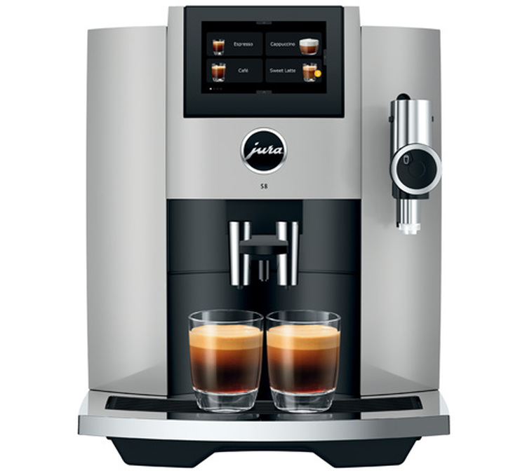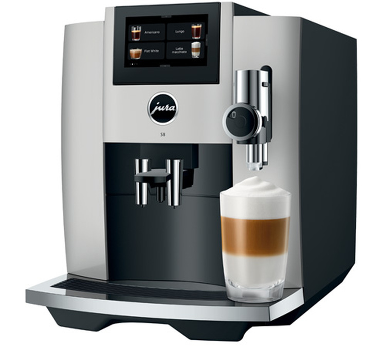 Entdecken Sie die Jura S8 mit modernster Technologie: einer Hochleistungs-Kaffeemühle, einem optimierten Brühkreislauf und einem 4,3-Zoll-Touchscreen.