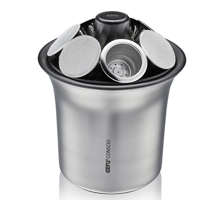 Entleeren Sie Ihre Nespresso* Original Conscio kompatiblen Kapseln von Gefu, aber auch von anderen Marken, mühelos in diesen Kaffeesatzbehälter aus Edelstahl und Silikon. Dieser Behälter wird hermetisch mit einem Deckel verschlossen. In demselben Deckel können bis zu sechs Conscio-Kapseln aufbewahrt werden: nützlich und praktisch, um alle Ihre Utensilien an einem Ort zu haben!