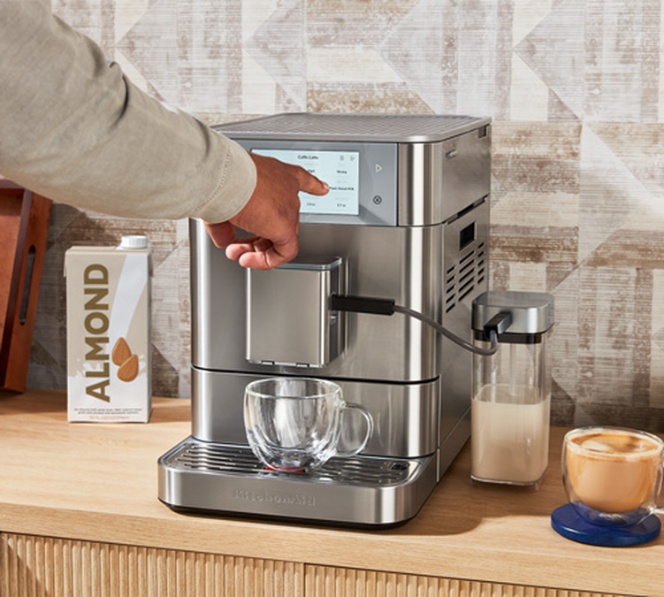 Entdecken Sie das Sortiment KF8 von KitchenAid, mit dem Sie bis zu 40 Getränke auf Basis von Kaffee, tierischer und pflanzlicher Milch zubereiten können. Der Kaffeevollautomat von KitchenAid greift das bekannte Design der Marke mit hochwertigen Materialien wie einem Gehäuse aus Edelstahl auf. Das große 5-Zoll-Display sorgt für eine reibungslose Bedienung, die Anzeige der Einstellungen und Getränke ist intuitiv. Die großen Behälter der KitchenAid-Maschine sind für den Familiengebrauch geeignet: ein Bohnenbehälter für 270 g, ein Wasserbehälter für 2,2 Liter und ein Siebträgerbehälter für 12 Kaffee-Pucks. Der Kaffeevollautomat KF8 ist mit einem herausnehmbaren Bohnenbehälter ausgestattet, damit Sie die Kaffeesorte jederzeit wechseln können. Die Maschine hat eine Garantie von 3 Jahren und eine Reparaturfähigkeit von 10 Jahren.