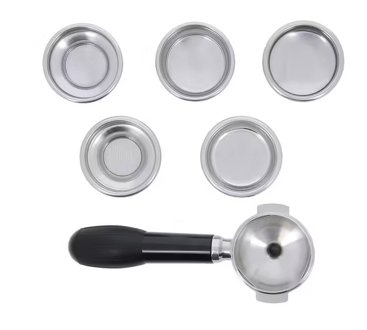 Mitgeliefertes Zubehör: Filterhalter mit 2 Tüllen, Druckfilter für 1 Tasse, Druckfilter für 2 Tassen, Blindfilter, Einfacher Filter für 1 Tasse, Einfacher Filter für 2 Tassen, 58 mm Edelstahl-Sieb.