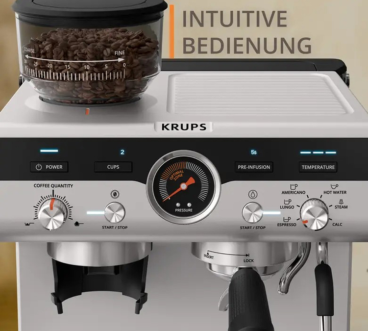 Die Benutzeroberfläche der Krups Precision + ist leicht zu erlernen. Sie können die Mahlmenge Ihrer Wahl einstellen und zwischen einer Extraktion für 1 oder 2 Tassen wählen. Das Druckmessgerät an der Vorderseite der Kaffeemaschine ermöglicht Ihnen eine bessere Kontrolle über Ihre Extraktion und ein noch besseres Kaffeeerlebnis.