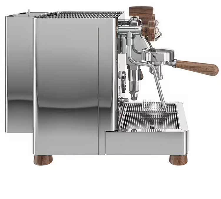 Sie hat alle Basen des Vorgängermodells übernommen, mit einem schönen Gehäuse und Doppelkessel aus Edelstahl, Holzoberflächen und der L58E-Brühgruppe , die mit einem Wärmetauscher gekoppelt ist.