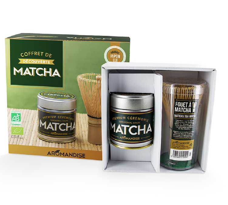 Möchten Sie Matcha-Tee kennenlernen? Entscheiden Sie sich für dieses Set! Es enthält einen Matcha-Tee von Cérémonie Aromandise (ein feines Pulver in zartem Grün mit cremigen Geschmacksnoten von Chlorophyll) sowie einen Matcha-Besen.