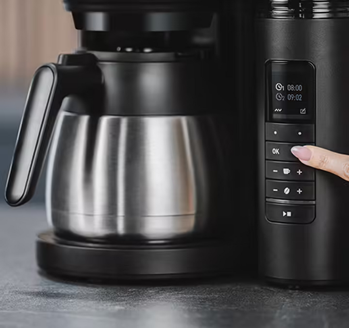 Programmieren Sie die Wasser- und Kaffeedosierung ganz einfach über ein intuitives TFT-Farbbedienfeld vor. Dieses Panel präsentiert Ihnen ein Auswahlmenü und zwei Timerfunktionen, die die Kaffeezubereitung einfach und den Kaffee selbst sehr geschmacksintensiv machen. Die mit Isolierfunktion ausgestattete Kanne hält Ihren Kaffee lange warm.