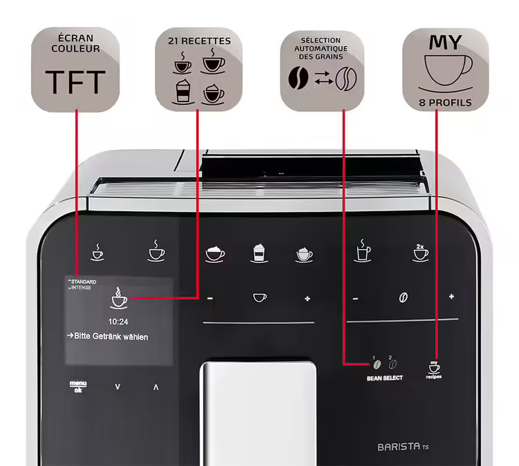 Der Melitta Caffeo Barista TS Smart Kaffeevollautomat ist mit Ihrem Tablet oder SmartPhone verbunden. Er bietet eine Auswahl von 21 Kaffee- und Gourmetgetränken sowie eine Reihe von unverzichtbaren Extras: One-Touch for Two-System, doppelter Bohnenbehälter, um von der ersten Extraktion an ohne Verluste von einer Kaffeesorte zur anderen zu wechseln. Ein Design-Kaffeevollautomat mit Edelstahl-Front, leistungsstark und sehr wirtschaftlich.