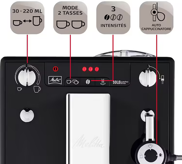 Der Vorteil dieses Kaffeeautomaten Melitta Caffeo Solo Perfect Milk im Vergleich zum Solo Milk ist, dass er über das Cappucinatore-System verfügt. Das Cappuccinatore-System sorgt dafür, dass der Milchschaum schnell und einfach zubereitet wird. Eine manuelle Steuerung für die Wahl der Menge durch einen Bedienknopf. So können Sie genau die Menge wählen, die am besten in Ihre Tasse passt. So können Sie Ihren Milchschaum mit nur einem Handgriff zubereiten.