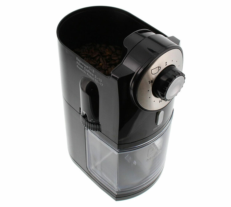 Die Melitta Molino in schwarz ist eine einfache Mühle und dank ihrer abnehmbaren Komponenten (abnehmbarer Mahlstein, abnehmbarer Behälter für gemahlenen Kaffee und abnehmbarer Deckel des Bohnenbehälters) schnell zu reinigen .