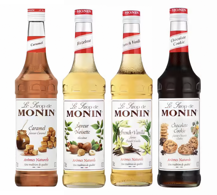 Entdeckerset Monin Sirup. Entdecken Sie die Geschmacksrichtungen Vanille (french vanilla), Karamell, Chocolate Cookie und Nuss.