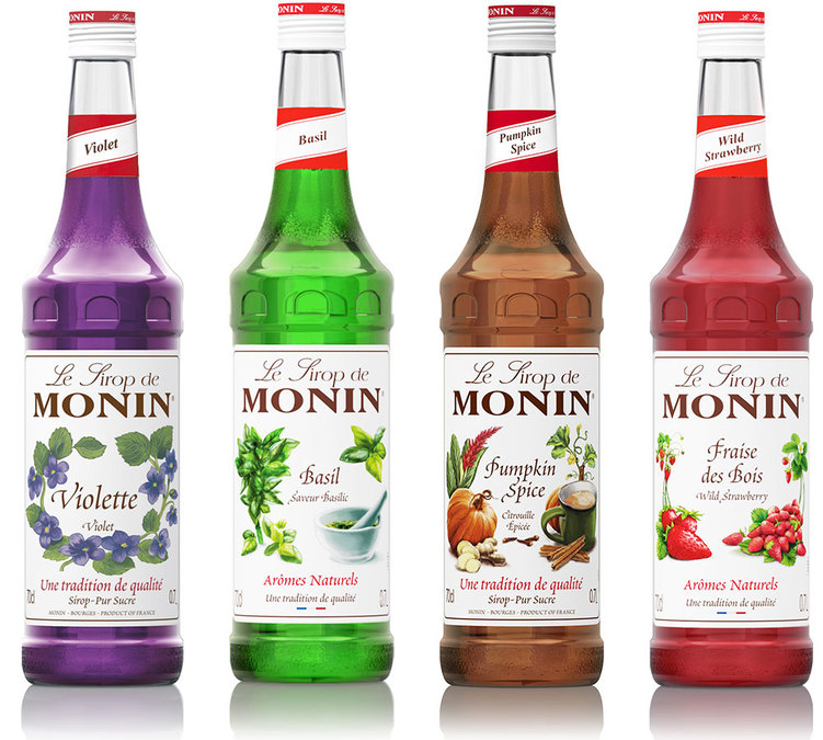 Entdecken Sie die Auswahl an Sirupen von Monin: Basilikum, Walderdbeere, Veilchen und Pumpkin Spice.