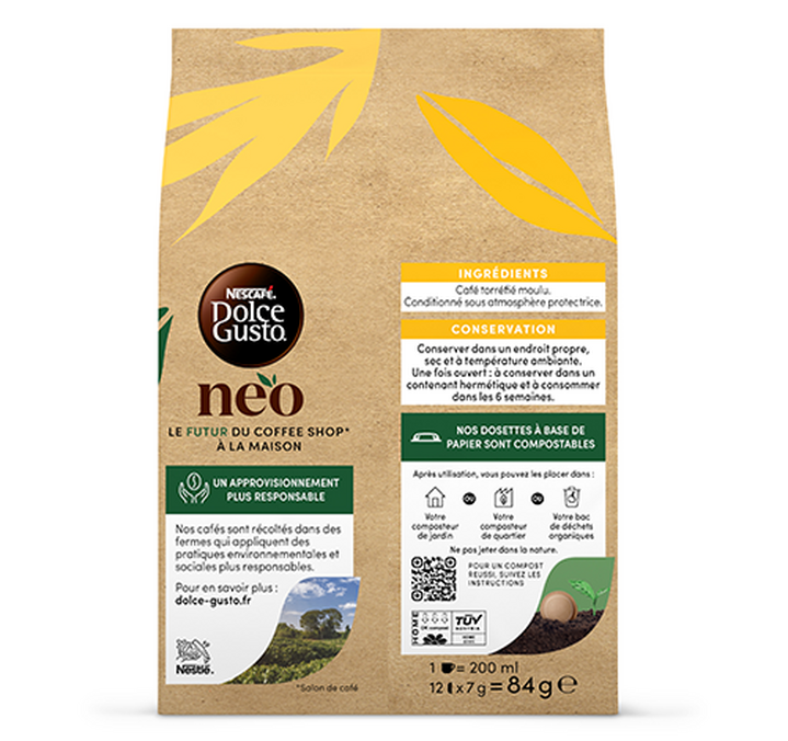 Sie haben Lust auf einen guten Kaffee, aber auch ein ökologisches Gewissen? Machen Sie sich keine Sorgen. Diese Neo-Kapseln sind recycelbar. Sie können sie in den Komposter in Ihrem Garten, in den Komposter in Ihrer Nachbarschaft oder in einen Behälter für organische Abfälle geben.