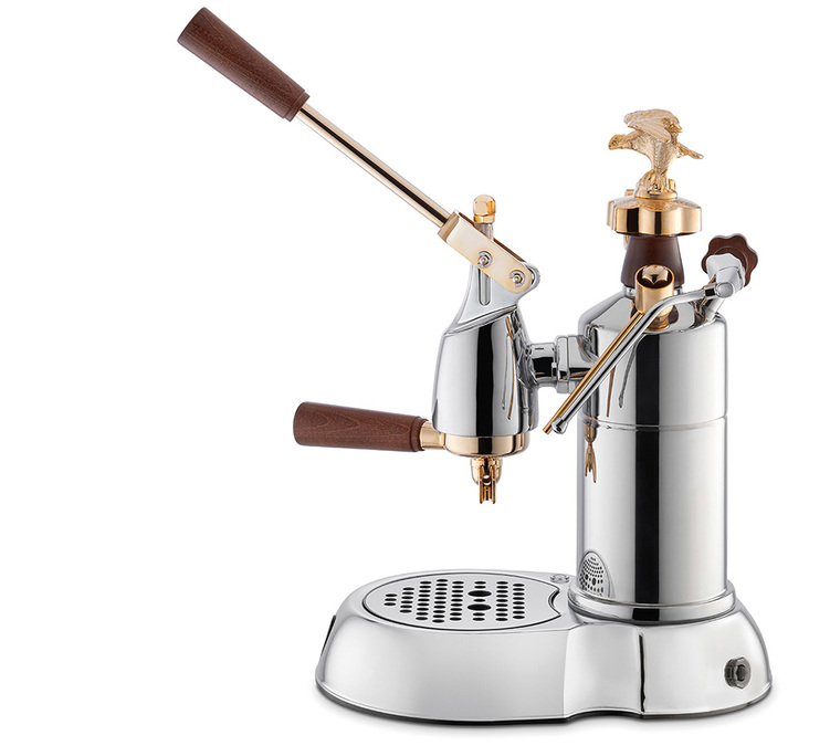 Modell LA PAVONI EXPO LPLEXP01EU mit Edelstahlbasis, Edelstahlgehäuse und Goldfinish, Rädchen und Holzgriff.