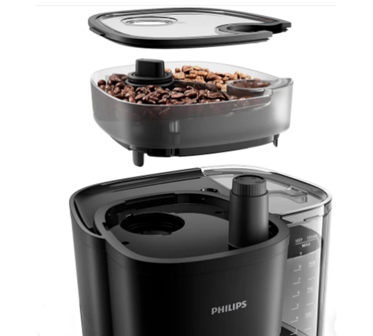 Entdecken Sie die neue Philips-Filterkaffeemaschine, bei der Kaffeebohnen in zwei verschiedenen Behältern aufbewahrt werden können, um bei Bedarf auszuwählen, welcher Kaffee zubereitet werden soll.