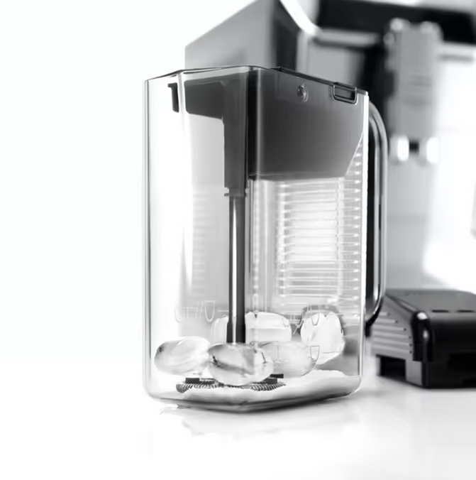 Der Kaffeevollautomat PrimaDonna wird mit zwei verschiedenen Karaffen geliefert: eine klassische Milchkaraffe für Milchgetränke (Cappuccino, Latte Machhiato...), eine zweite Karaffe für heiße Schokolade, die mit einem Schokoladenquirl ausgestattet ist, der mit einem zweiten Quirl für exklusive Rezepte für Kaltgetränke ausgetauscht werden kann; eine Karaffe, in die Eiswürfel integriert werden können (2 Eiswürfelbehälter werden mitgeliefert).