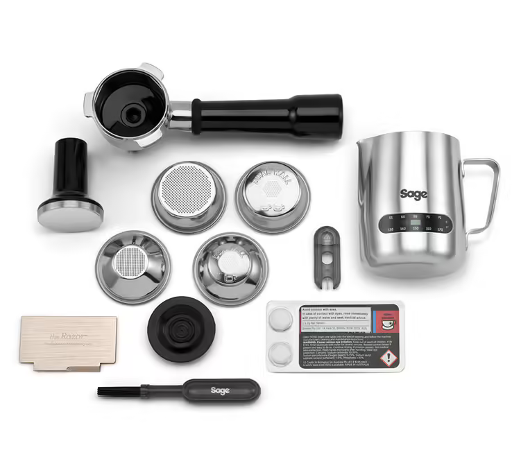 Zubehör : Edelstahlkanne für Milch, Reinigungsscheibe, Reinigungstabletten, Tamper, Druckfilter für eine Tasse, Druckfilter für zwei Tassen, Einfachfilter für eine Tasse, Einfachfilter für zwei Tassen, Filterkartusche mit Halterung, Reinigungsbürste, Präzisionsdosierwerkzeug „The Razor“, Reinigungswerkzeug für Dampfdüse, Inbusschlüssel.