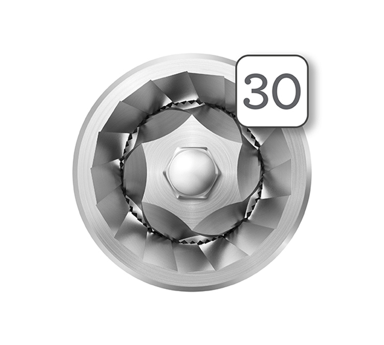 Die integrierte Kaffeemühle ist mit hochwertigen konischen Edelstahl-Mahlsteinen ausgestattet und verfügt über ein System mit 30 verschiedenen Einstellungen, um je nach ausgewählter Kaffeebohne die ideale Mahlung zu erzielen. Der Trichter fasst bis zu 340 g Kaffeebohnen.