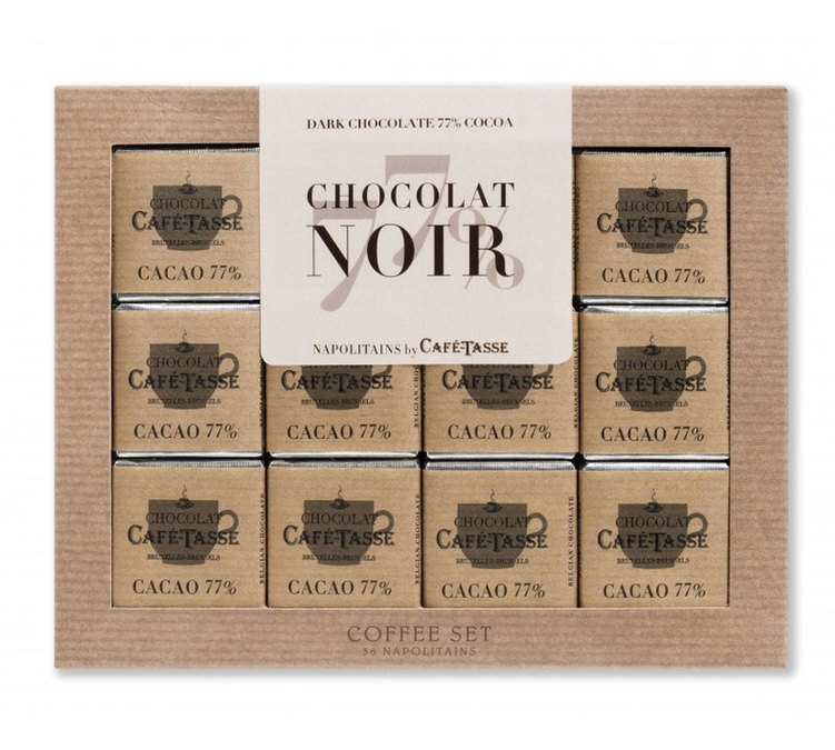 Entdecken Sie dieses Set mit 36 Napolitains der Marke Café Tasse aus Zartbitterschokolade mit 77% Kakaoanteil. Das kleine Vergnügen, um Ihre Kaffeepause zu versüßen.
