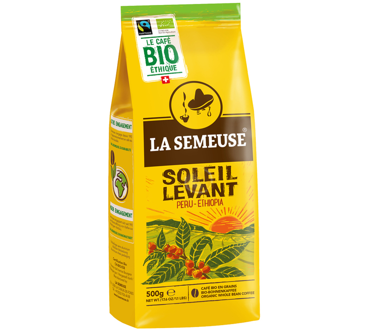 Der Kaffee Soleil levant von La Semeuse ist ein reiner Arabica Kaffee, der als aus biologischem Anbau zertifiziert und mit dem Fairtrade-Label ausgezeichnet ist. Das bedeutet, dass er aus äthiopischen und peruanischen Plantagen stammt, die umweltfreundlich sind und die Produzenten respektieren.