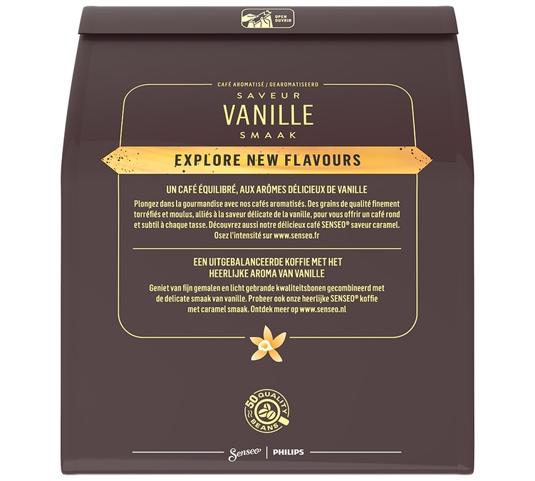 Entdecken Sie die Senseo® Vanille Pads, die mit den Senseo® Kaffeemaschinen kompatibel sind. Die schonende Röstung verleiht diesem Kaffee einen milden und raffinierten Charakter mit einem Hauch von Vanille.