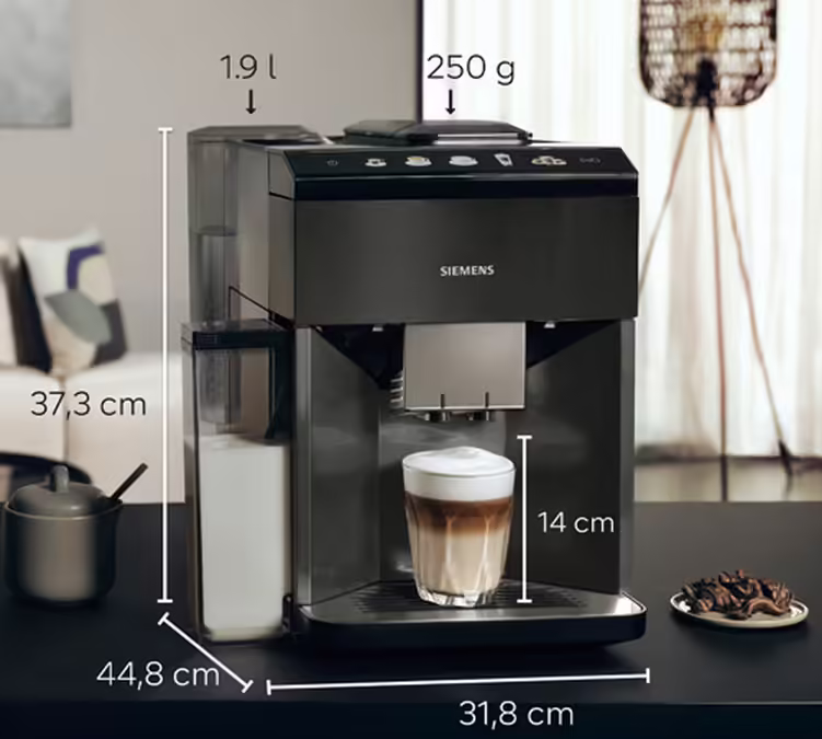 Mit seinen großen Behältern bereitet der Siemens TQ518RX3 Getränke für die ganze Familie zu. Darüber hinaus bietet die Maschine bis zu 17 Kaffee- und Milchgetränke. Sie haben die Möglichkeit, die Maschine mit der Home Connect App zu verbinden, um weitere Getränke und zusätzliche Funktionen zu entdecken.