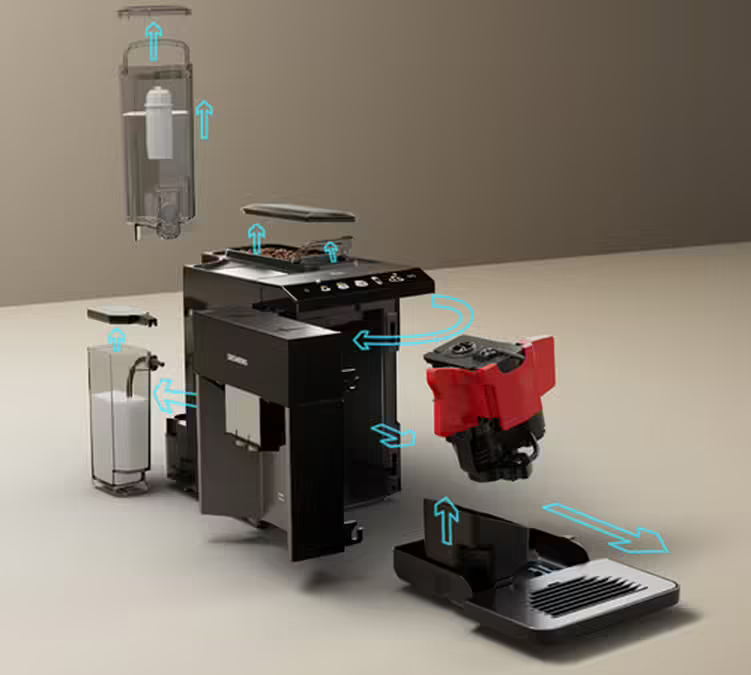 Dieser smarter Kaffeevollautomat Siemens EQ.500 S700 bietet eine perfekte Wartungsfreundlichkeit. Ihre Brühgruppe ist über die Vorderseite zugänglich, sodass sie leicht von Hand gereinigt werden kann. Nehmen Sie die Brühgruppe einmal pro Woche heraus (achten Sie darauf, dass die Maschine ausgeschaltet ist), reinigen Sie sie unter lauwarmem Wasser, um Mahlgut und Kaffeeölrückstände zu entfernen, lassen Sie sie trocknen und setzen Sie sie dann wieder in die Maschine ein.