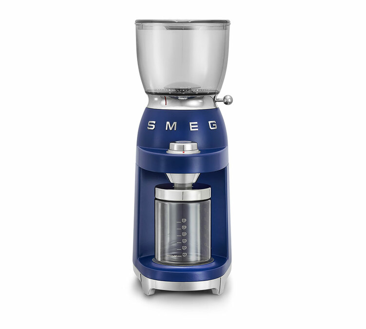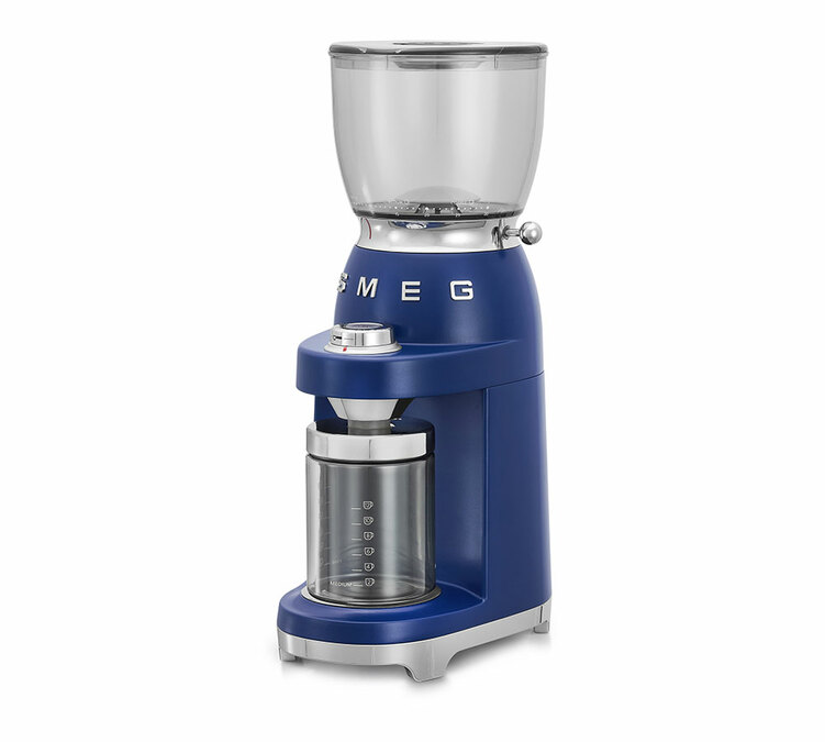 Die berühmte Kaffeemühle von Smeg präsentiert sich in einer Sonderausgabe mit diesem Modell CGF01LVEU in der Farbe Lavazza Blue 1895.