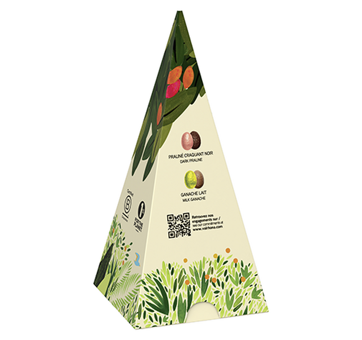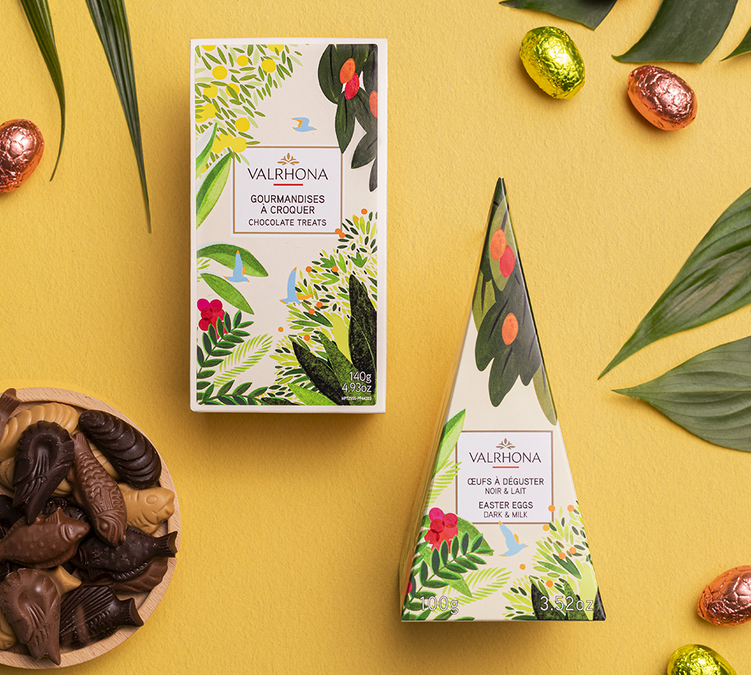 Die Marke Valrhona lädt Sie anlässlich Ostern mit diesem originellen kegelförmigen Päckchen mit einer Auswahl von 100 g Schokoladeneiern zu sich nach Hause ein. In dieser Packung finden Sie zwei originelle und köstliche Rezepte: ein knuspriges Praliné mit Zartbitterschokolade und eine Milchschokolade mit einer Ganache Tanariva 33 %, einem Grand Cru Pure Origine Madagaskar.