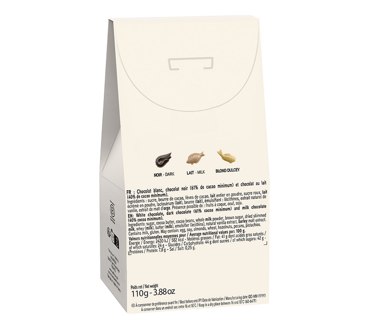 Genießen Sie zu Ostern köstliche kleine Schokoladenfische! Valrhona bietet eine Schachtel mit köstlichen Leckereien, die nicht nur lecker, sondern auch schön anzusehen sind. Diese Schachtel mit 140 g enthält eine Auswahl an Milchschokolade, Zartbitterschokolade und Dulcey-Schokolade: eine ideale Auswahl, um Groß und Klein eine Freude zu machen!