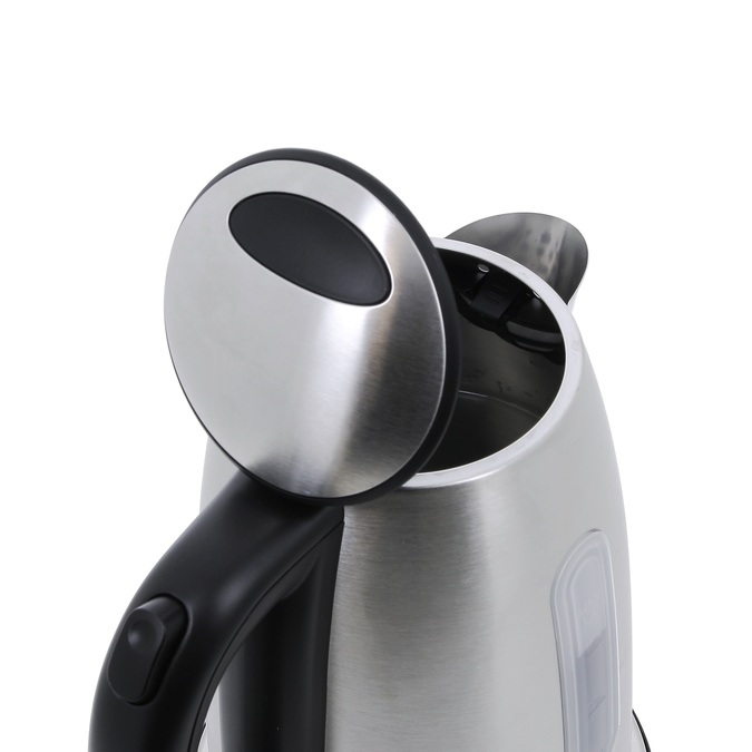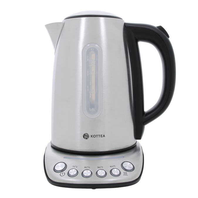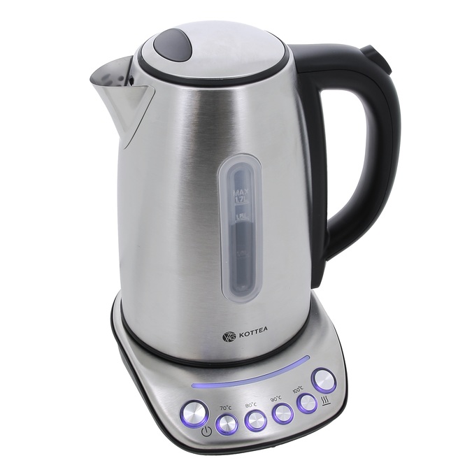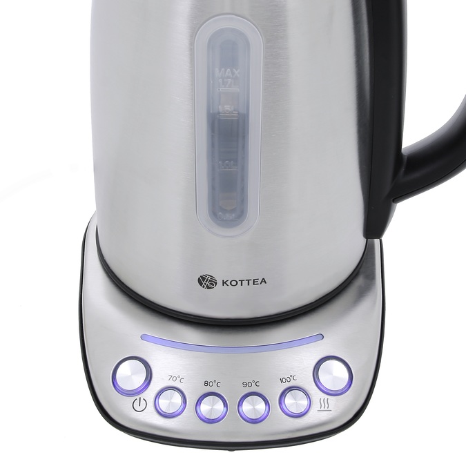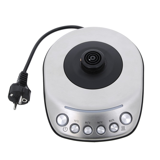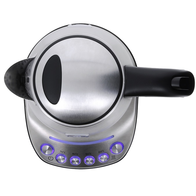 Dies ist ein Wasserkocher mit einer hervorragenden Verarbeitung, insbesondere auf dem Bedienfeld der Basisstation, wo jeder Knopf blau hinterleuchtet ist. Diese hintergrundbeleuchteten Tasten ermöglichen es Ihnen, schnell zu sehen, wann das Gerät eingeschaltet wird.